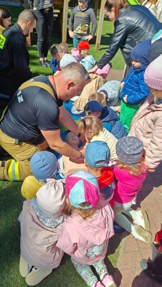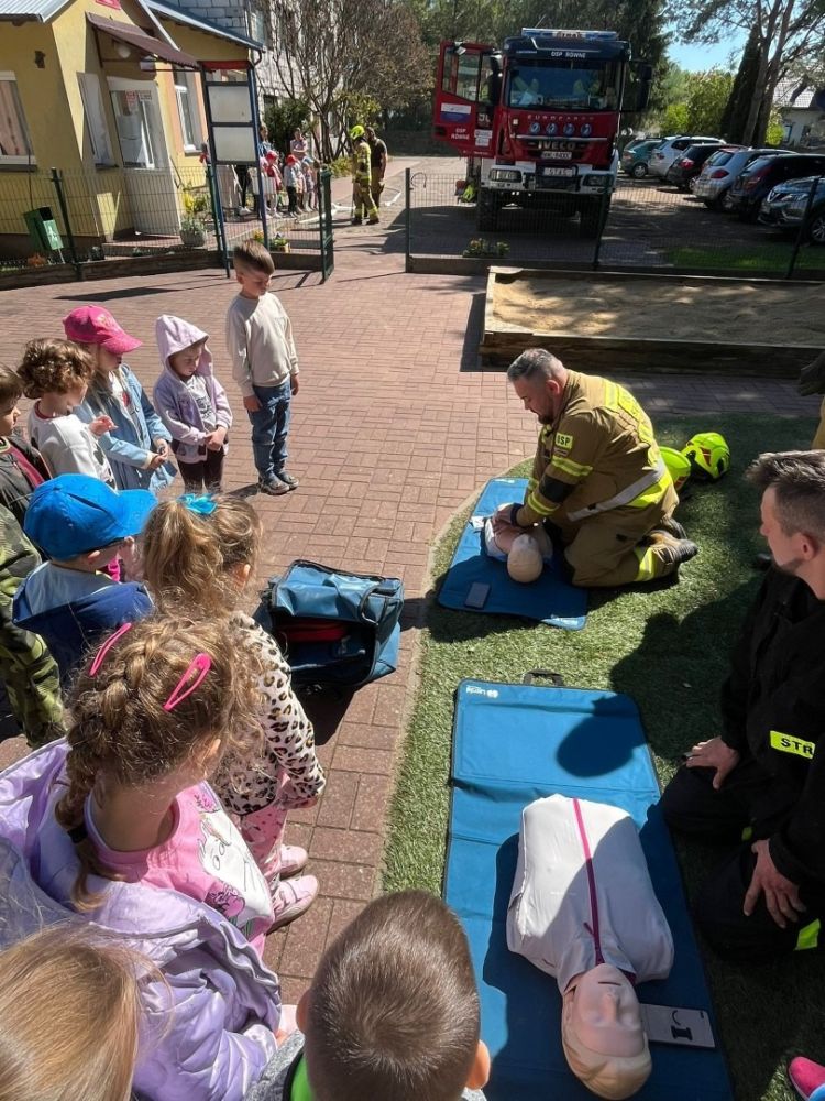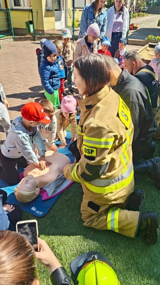 Niezwykle ważnym elementem spotkania było przeprowadzone przez strażaków mini szkolenie z pierwszej pomocy – dzieci przypomniały sobie numery alarmowe i nauczyły się, jak wezwać pomoc i jak pomóc komuś w potrzebie. Największą atrakcją było ćwiczenie masażu serca na fantomie – małe rączki spisały się świetnie!