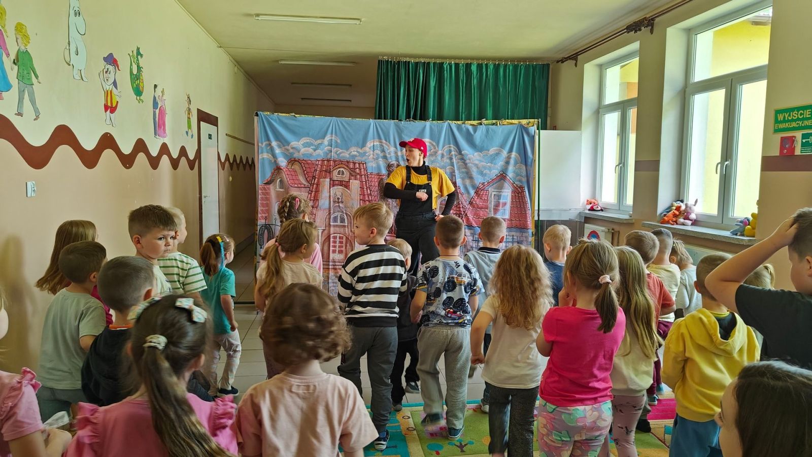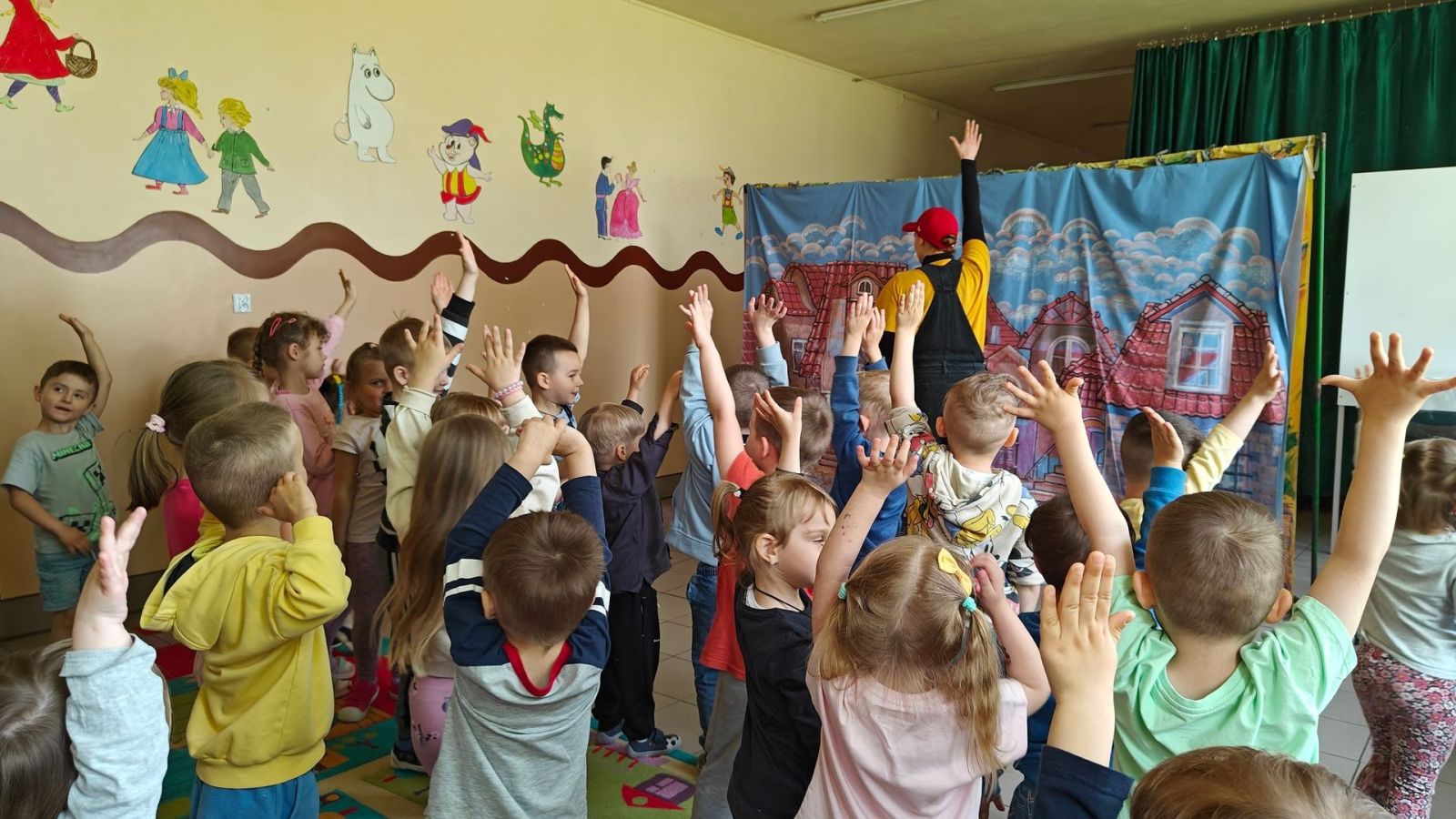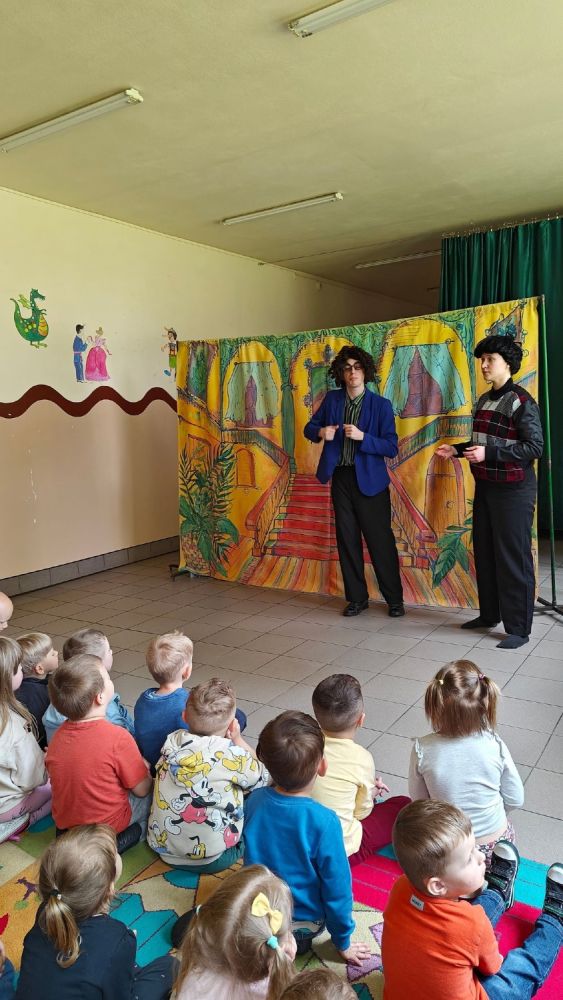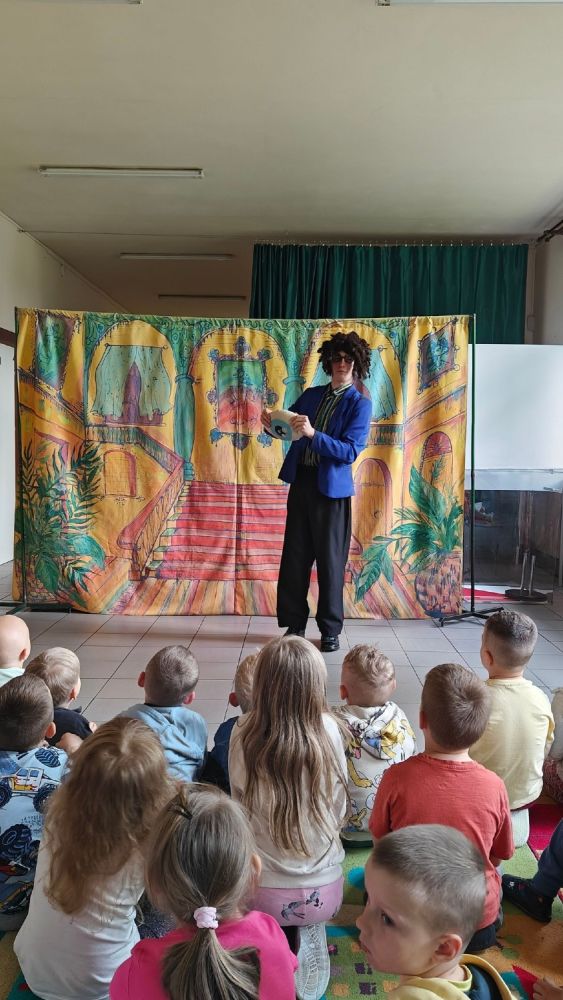 Teatr Blaszany Bębenek wystąpił w naszym przedszkolu z przedstawieniem „Szkoła Pana Kleksa”. Spektakl przybliżał dzieciom myśl, że w życiu człowieka ważne są książki i czytanie bajek. Znakomita gra aktorska i bogata scenografia pozwoliły dzieciom wyruszyć w niezwykłą przygodę. Pan Kleks jako dyrektor szkoły razem ze swoim uczniem Adasiem i mówiącym szpakiem Mateuszem sprawili, że dzieci pięknie bawiły się, przeżyły moc pozytywnych emocji mając wiele okazji do śmiechu i zabaw ruchowych. Szukając magicznego przycisku i zagubionych piegów Pana Kleksa poznały sprytnego golarza Filipa z jego lalką robotem i szczęśliwe pieski. Dzieci podczas całego spektaklu były bardzo skupione i zainteresowane tym, co działo się na teatralnej scenie. Przedszkolaki Bajkowej Akademii podziękowały aktorom gromkimi brawami i wspólną fotografią.