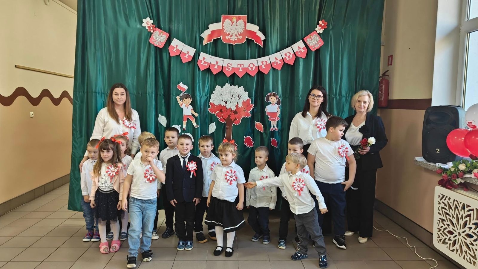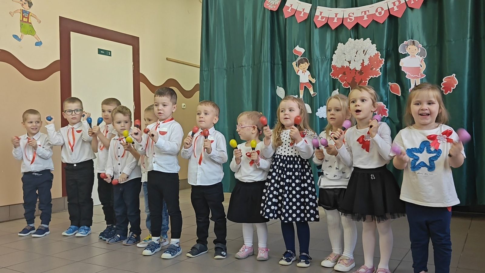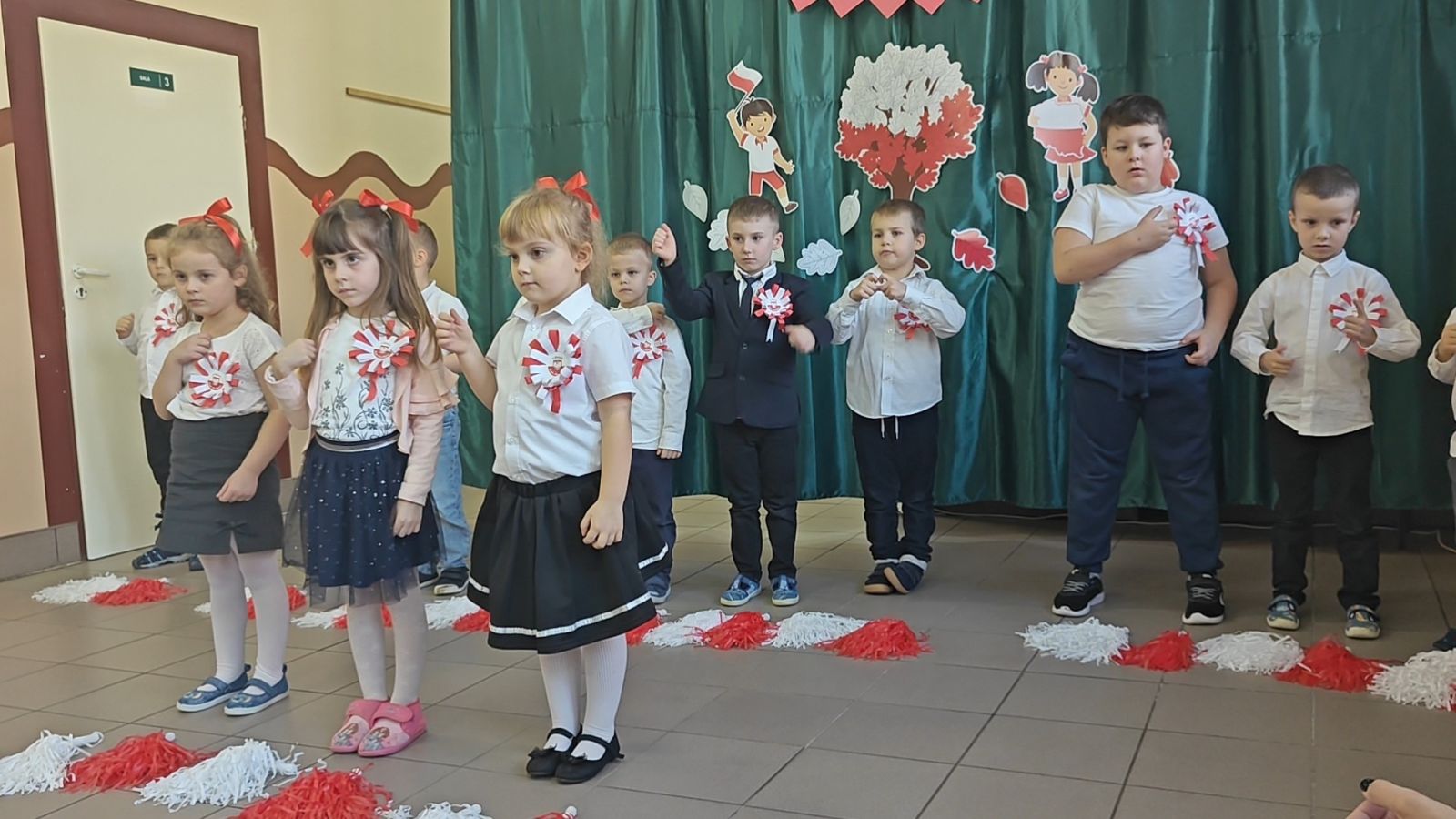 Z tej okazji dzieci przyszły do przedszkola ubrane były na galowo z przypiętymi na piersiach narodowymi kotylionami. Przedszkolne dekoracje, natomiast przybrały biało – czerwone barwy i pojawiły się na nich symbole narodowe. Polskie flagi pojawiły się, także na zewnątrz przedszkolnego budynku, tak jak nakazuje tradycja i szacunek do naszej ojczyzny.