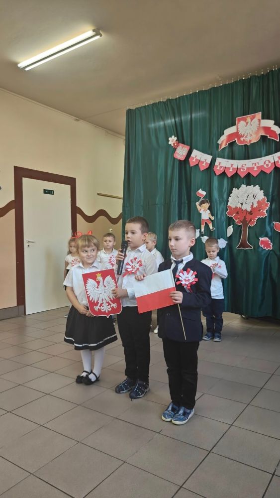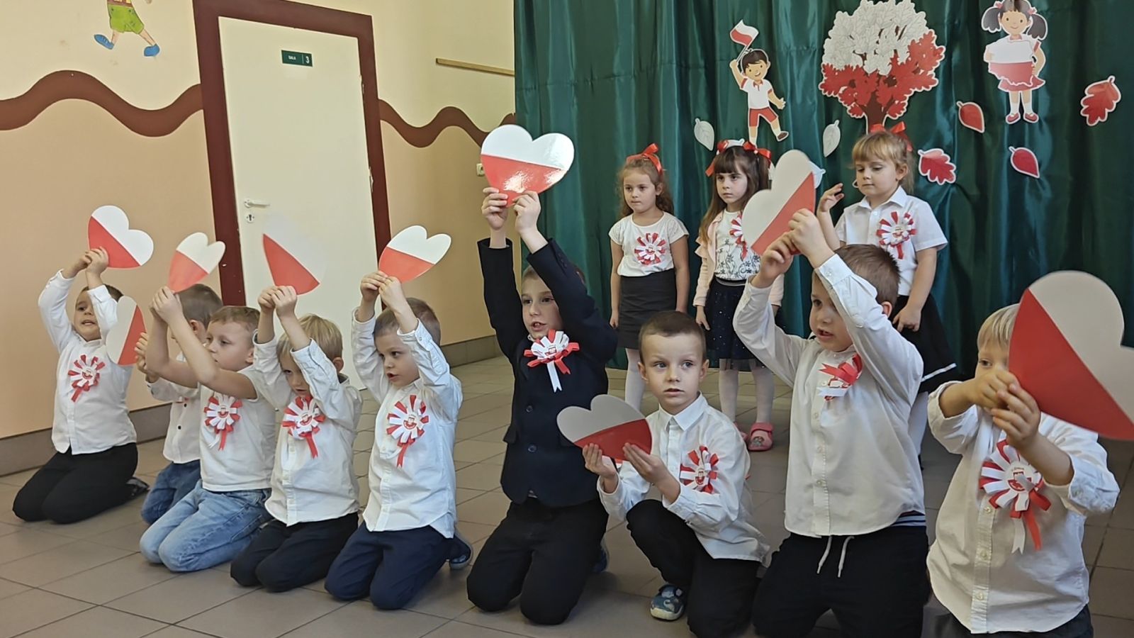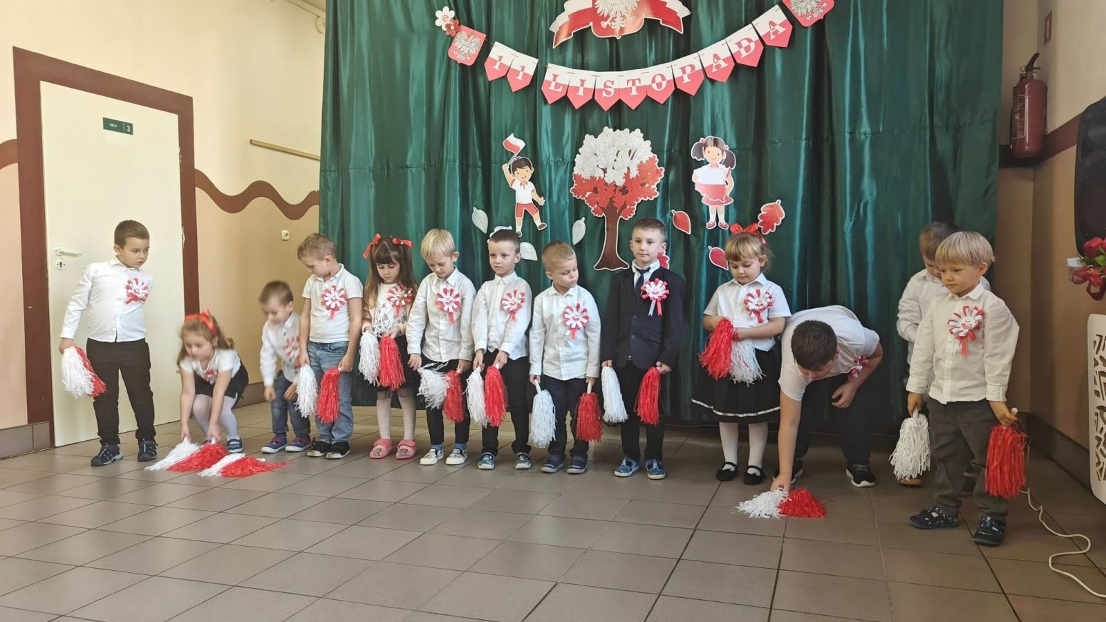 Z tej okazji dzieci przyszły do przedszkola ubrane były na galowo z przypiętymi na piersiach narodowymi kotylionami. Przedszkolne dekoracje, natomiast przybrały biało – czerwone barwy i pojawiły się na nich symbole narodowe. Polskie flagi pojawiły się, także na zewnątrz przedszkolnego budynku, tak jak nakazuje tradycja i szacunek do naszej ojczyzny.