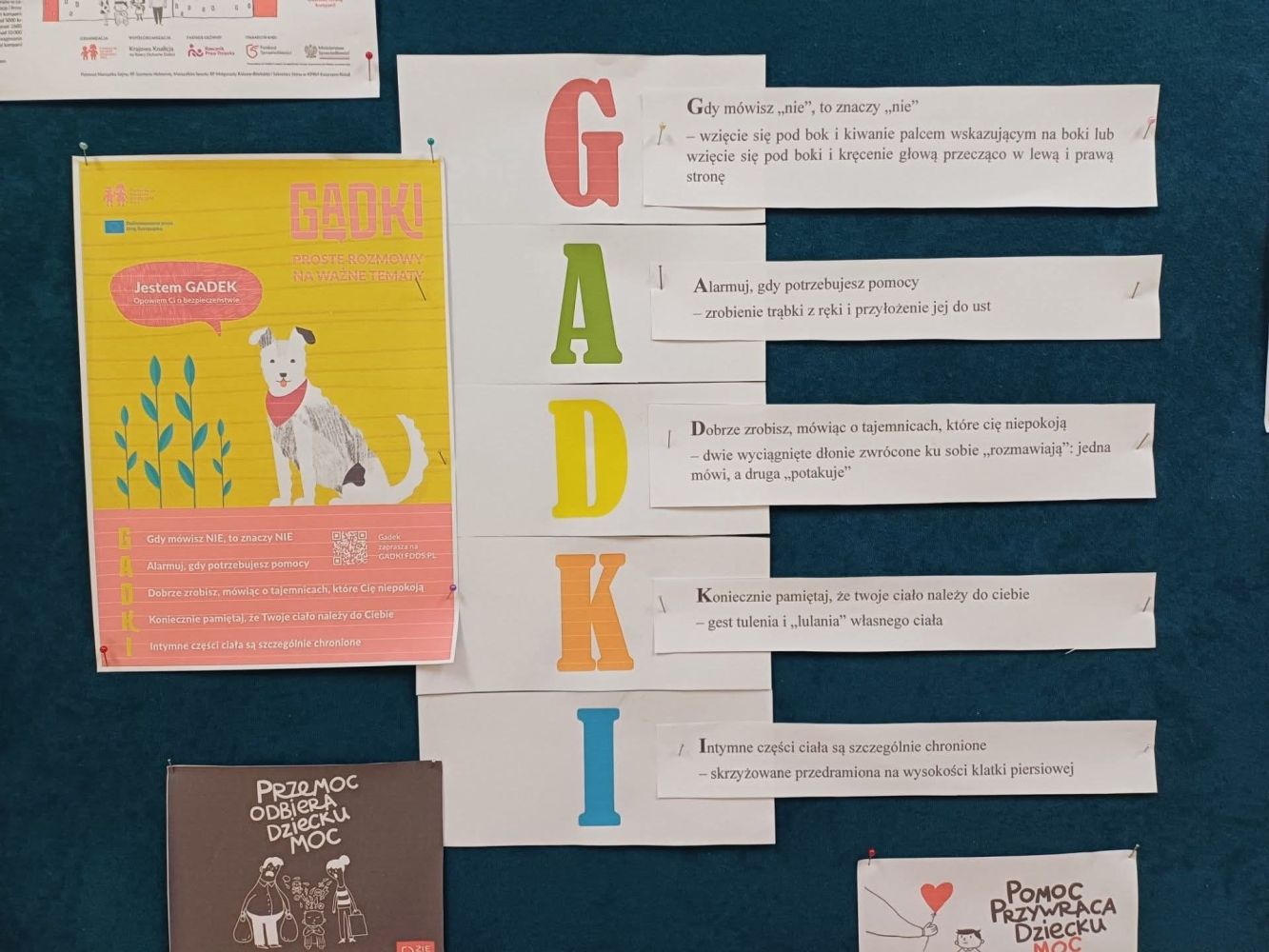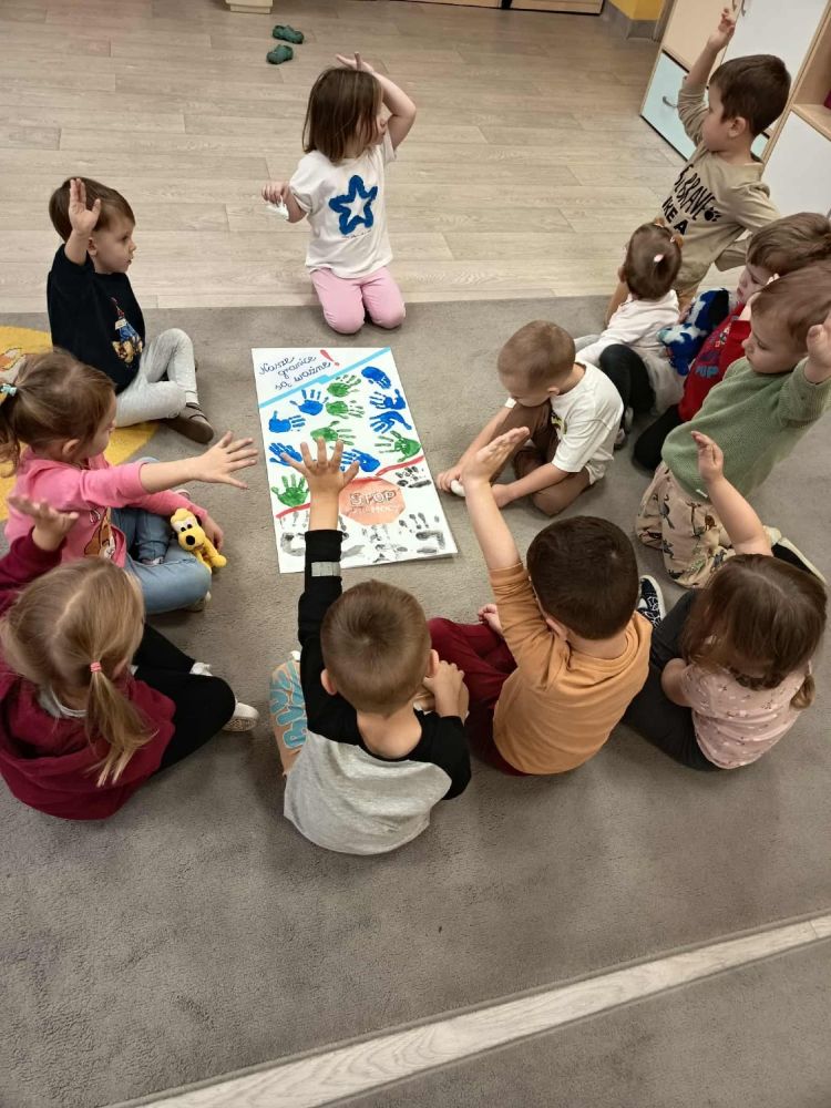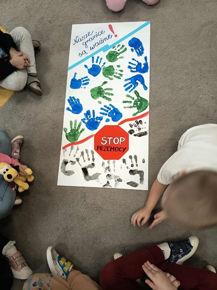 W trosce o najmłodszych zrealizowaliśmy szereg działań skłaniających do podkreślenia wagi reagowania na przemoc. W ramach działalności przeprowadziliśmy zajęcia edukacyjne - uczyliśmy bezpiecznych zachowań i reakcji. Na korytarzu przedszkola przygotowaliśmy gazetkę z informacjami dotyczącymi Kampanii oraz ważnymi hasłami dla rodziców. Zachęcaliśmy rodziców i bliskich dzieci do udziału w szkoleniach. Kadra uczestniczyła w webinarach i podcastach. Podpisaliśmy manifest Dzieciństwo mocy bez przemocy na rzecz dobrego, bezpiecznego dzieciństwa. W ramach zajęć plastycznych dzieci wykonały plakaty ,,STOP PRZEMOCY".
