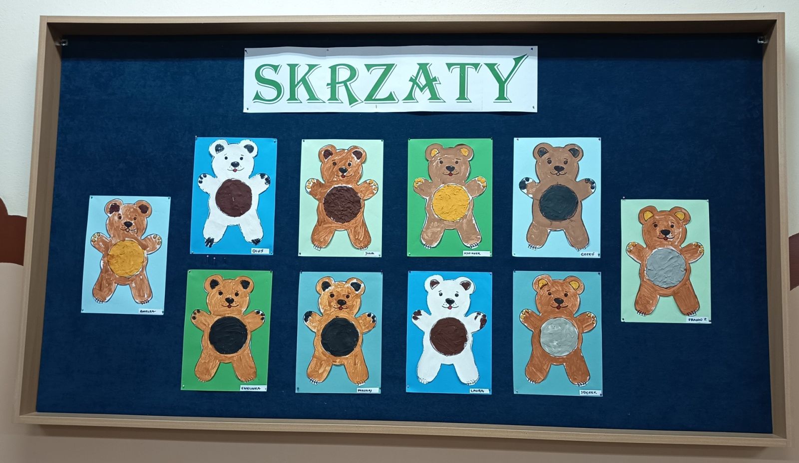 piosenek nadały uroczystości wyjątkowego, bajkowego charakteru. Dzieci z zaangażowaniem brały udział w proponowanych zabawach, jednocześnie pokazując swoje ulubione pluszaki, opowiadając o nich i bawiąc się z nimi. Święto zakończyliśmy wykonaniem misiowych portretów, które stały się piękną pamiątką tego wyjątkowego dnia i udekorowały wystawki prac w holu wejściowym.