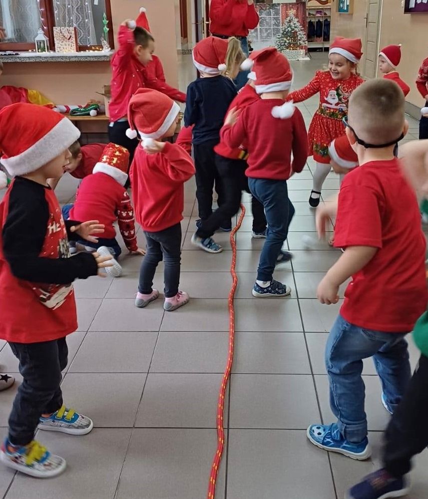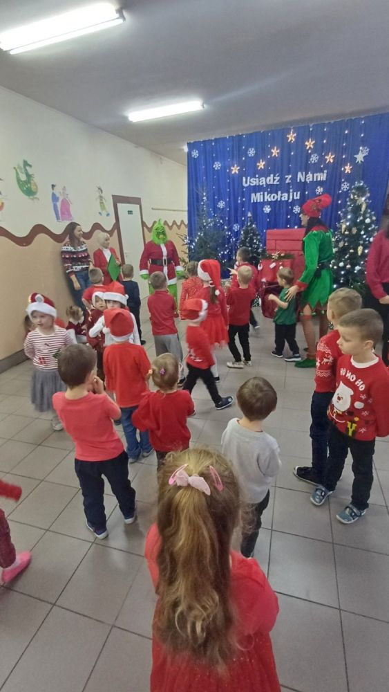 Spotkanie Mikołajkowe, wprowadzając nas w świąteczną atmosferę, rozpoczęła Pani Dyrektor witając wszystkie dzieci i zapraszając do wspólnego udekorowania choinek – każde dziecko mogło wybrać i zawiesić kolorową bombkę. Kiedy choinki zostały już przyozdobione rozświeliło je mnóstwo lampek, a hol rozbłysnął świąteczną iluminacją tworząc radosną oraz magiczną atmosferę. Potem przyszedł czas na mikołajkowe zabawy! Dzieci wspólnie z Elfem przygotowywały się na wizytę Mikołaja. Powtarzając zimowy wierszyk rozpoczęły się animacje z chustą – zimowa fala, burza śnieżna, zamrożenie oraz podróż do Laponii. To była rozgrzewka przed wielką bitwą na śnieżki, która sprawiła dzieciom wiele radości. Pośród atrakcji przygotowanych przez animatorki było świąteczne limbo, taniec z laską cukrową oraz zabawy w kole ze zimowymi zagadkami i świąteczna lokomotywa. Zanim jeszcze Święty Mikołaj pojawił się na sali dzieci napisały do niego listy, a kiedy już chciały wrzucać je do skrzynki na sali zjawił się nikt inny jak zielony potwór zwany Grinchem. Czy myślicie, że udało mu się popsuć naszą zabawę i ukraść prezenty? Nic podobnego! Dzieci oswoiły potwora i zabawa zakończona konfetti trwała dalej. Radości nie było końca! W drugiej części Mikołajkowej Zabawy uczestniczyli również przedstawiciele Gminy Strachówka oraz rodzice, których serdecznie powitała Pani Dyrektor. Nastąpiło wspólne oczekiwanie na pojawienie się Świętego Mikołaja. Grupa 5 latków przygotowała piosenkę zapraszając do nas wyczekiwanego gościa, który długo nie pojawiał się na holu. Kiedy wreszcie do nas dotarł dzieci nie kryły ekscytacji. Przedstawiciele Gminy: przewodnicząca Rady Gminy P. Hanna Wronka oraz radna P. Edyta Przybysz powitały wszystkich zgromadzonych oraz Mikołaja i przekazały dzieciom pudła pełne prezentów. Następnie przedszkolaki z obydwu grup zaprezentowały swoje zdolności: recytowały wiersze, śpiewały piosenki, tańczyły i grały na dzwonkach. Mikołaj był pod wielkim wrażeniem! Każde dziecko zostało obdarowane upominkiem, ale Mikołaj nie zapomniał również o dorosłych i gościach – miał słodkie upominki. Dzieci choć trochę już zmęczone wyszły z przedszkola z uśmiechami na twarzy. Tego dnia powstały przepiękne sesje fotograficzne w świątecznej scenerii, wykonywane zarówno przez kadrę przedszkola, jak i rodziców. To był ekscytujący, pełen wrażeń dzień!