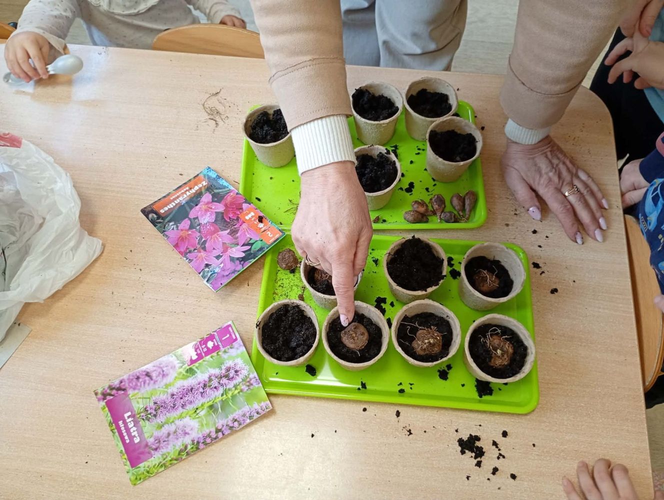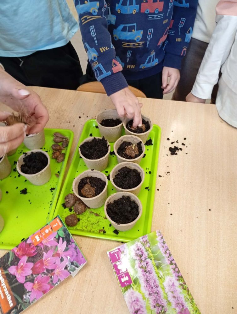 🪴 Do doniczek z ziemią posadziły cebulki kwiatowe.