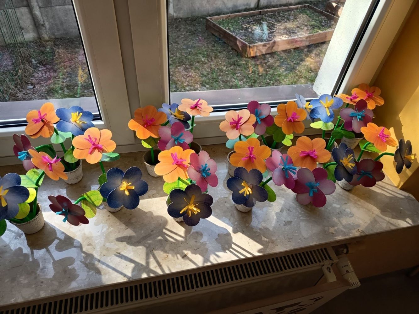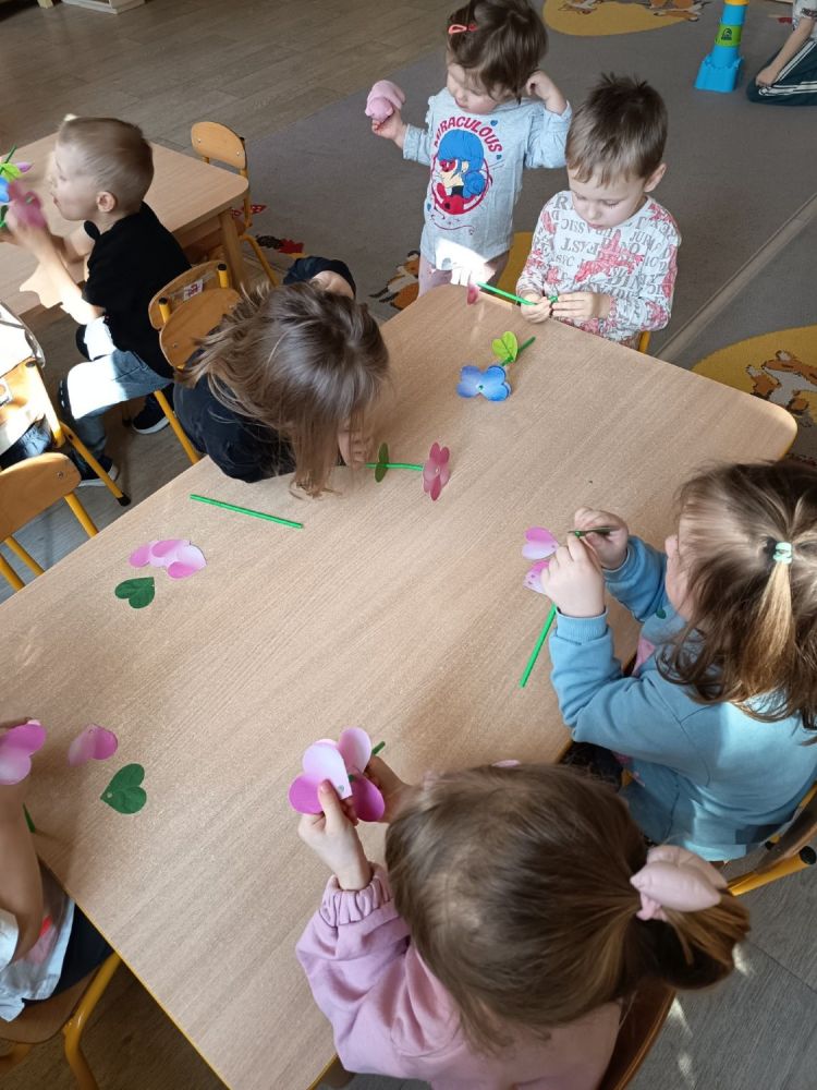 🌸 Skrzaty wykonywały wiosenne kwiaty z kolorowych elementów i zielonych słomek, a wspólną naukę i zabawę umilały im piosenki: „Kasza marcowa”, „Marzec czarodziej” oraz „Wiosna tuż, tuż”.